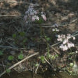 Small pink flowers growing on thin stem surrounded by ground cover.