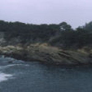 A thick grove of cypress trees lines the top of the rocky cliffs on the shoreline at Point Lobos.