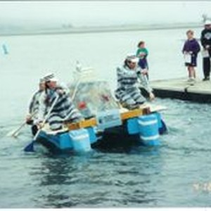 Photo -color: Fisherman's Festival in Bodega Bay, 1997. 'The Rock' float of Bodega Marine Laboratory with crew paddling float.