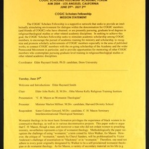 Church of God in Christ (COGIC) scholars fellowship academic forum (Auxiliaries in Mission (AIM)) program, Los Angeles, California, 2004 June 29 - July 2. [Description English/roman)]