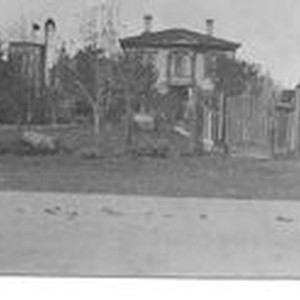 Print: black and white: Two story house with two chimneys seen in the distance with a windmill and water tower to the left. Caption on verso: Lillian and Harry's Yolo abode."