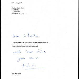 Correspondence to Charles Handy from Ram Gidoomal congratulating Handy on his name being in the New Year Honours list, January 12, 2000; Charles Handy Papers; Box 13, Folder 16; 1 page
