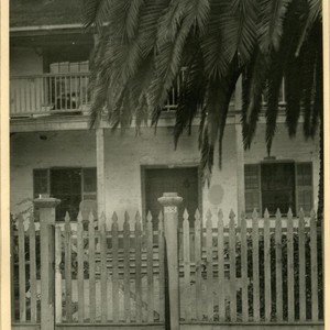 Adobe, Monterey, California: picket fence with house, palm tree [Stokes Adobe, Harnell St].