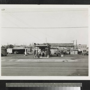 View of a Shell gasoline station with Aliso St. Garage and a sign advertising parking in the background, on Aliso Street near Old Chinatown, Los Angeles. Title transcribed from photograph.