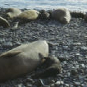 A seal pup is being nursed by its mother while other seals lay on rocks in the background.