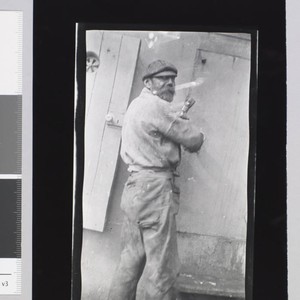 Sailor with paintbrush turns to look at camera on the ship Mexicano. Title and date devised by cataloger. Copy print of original. Jack and Charmian London took the Mexicano from Veracruz to Tampico Mexico in May of 1914.