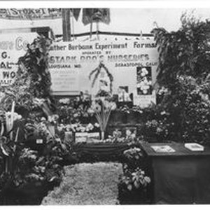 Photo: black and white: Burbank Experiment Farm display at Sebastopol Apple Blossom Fair. Display is of plants, flowers and fruit grown at the farm. about 1927-1928. Large banner states "Luther Burbank Experiment Farms (sic) operated by Stark Bro's Nurseries Louisiana, Mo Sebastopol, Calif." Advertisement of Stuart tents, awnings and covers at 160 Russ Street in San Francisco, CA. After Luther died in 1926, Mrs. Burbank leased the farm to Stark Bros. Nursery.