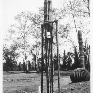 A recently planted pachycereus specimen in the desert garden. The label that accompanies this photo in the album reads "Pachycereus ruficeps transplanted, D-39."