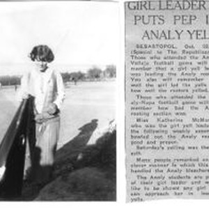 Photo--black and white: Analy High School yell leader (cheerleader) Katherine McMannis and accompanying newspaper article dated October 22, 1924.