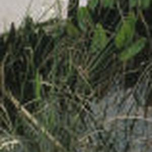 Tall grasses and green stalks rooted in water, some with white flowers, at a marsh at Mill Creek on James River.