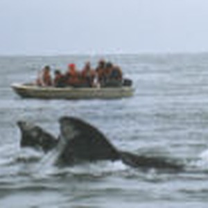 A clear view of a trio of whales with a small boat full of people close by in Scammon's Lagoon.