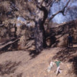 Trees on a hill with leaves and children playing in foreground at Tapia Park.