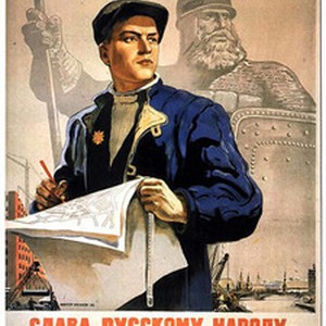 Soviet social poster. Caption reads, "Слава русскому народу -- народу-богатырю, народу-созидателю! / Slava russkomu narodu -- narodu-bogatyriu, narodu-sozidateliu!", meaning, "Glory to the Russian people -- people of heroes and creators!". [Description English/roman)]