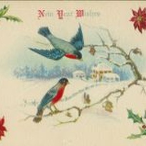 Postcard--color print: New Year's message. Design of winter scene with blue birds in foreground and house in background.