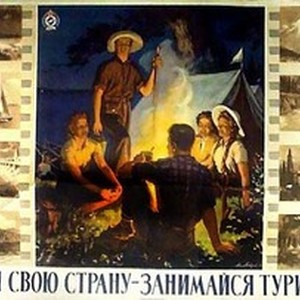 Soviet social poster. Caption reads, "Изучай свою страну -- занимайся туризмом! / Izuchai svoiu stranu -- zanimaisia turizmom!", meaning, "Know your country -- go outdoor, travel!". [Description English/roman)]
