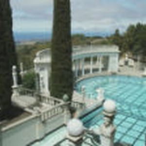 Dark green shrubbery and roman architecture surround the outdoor pool at the Hearst Castle.