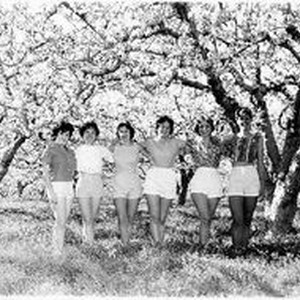 Photo--black and white: Young women in shorts in a Gravenstein apple orchard in bloom--Sebastopol 1961 Don Meacham photographer