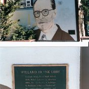 Photo--color: Willard F. Libby mural at Analy High School and a close up of the plaque that can be seen at Libby's left shoulder. The photos were taken to coincide with the dedication of Willard Libby Park in Sebastopol on May 6, 1984. Libby Park located at the corner of Valentine Avenue and Pleasant Hill Road was built in the mid-1970s, is situated in the west part of Sebastopol.