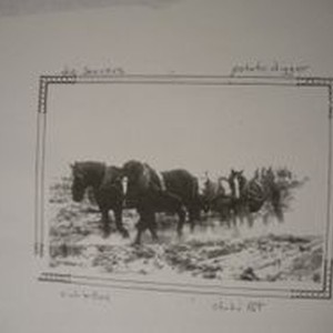 Photo--black and white: Photo of Joe Seavers on his potato digger pulled by horses Dick and Dan, front and Chub and Pat rear. Photo attached to 1984 handwritten autobiography of Myrtle Marie (Roberts) Seavers. SEE ARCHIVES 1038 FOR AUTOBIOGRAPHY.