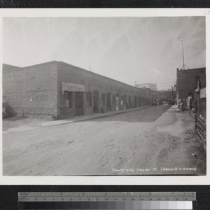 View of brick buildings lining Napier Street in Old Chinatown, Los Angeles, with automobiles and pedestrians. The Los Angeles Hall of Justice is visible in the background. Title transcribed from photograph.
