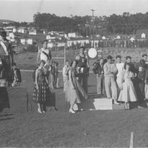 Photo--Black and white: Analy High School Track medal awards ceremony 1951. Four girls in dresses with corsages stand in front of the athletes standing on platforms.