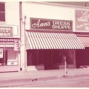 Photo--color, Kodacolor: The storefront of Ann's Dress Shoppe on west side of Main Street Sebastopol, 1956. Lash's Shoe Store is seen to the right.