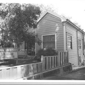 Photo, black and white: Sebastopol house at 167 North High Street, a Queen Anne Cottage built about 1905 in the Morris Addition. House photographed in 1993 by Evelyn McClure for her book "Sebastopol, California : History, Homes and People."