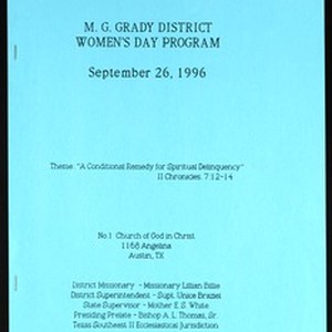 Women's day program, "A conditional remedy for spiritual delinquency", Texas southeast, Church of God in Christ, Austin, Texas, 1996 September 26. [Description English/roman)]
