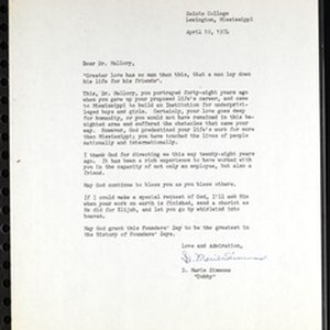 D. Marie "Dubby" Simmons (Saints College), Lexington, Mississippi, letter, 1974 April 19, to Arenia C. Mallory (Saints College), Lexington, Mississippi. [Description English/roman)]