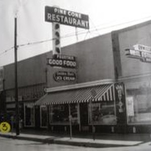 Photo--black and white: The Pine Cone Restaurant at 162 North Main Street circa 1950s. The location was originally Sylvia's Restaurant in the mid 1940s. Mr. C. G. Gulturis purchased the restaurant in 1949 and changed the name to the Pine Cone. In 1952 Ernie Julius was owner of the Pine Cone.