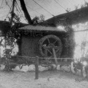 Photo--black and white, from Borba celluloid negative: Gravenstein Apple Show display by Pleasant Hill of a water wheel.