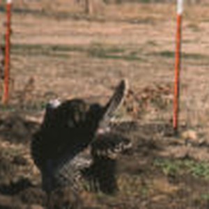 A male turkey strutting and showing the rear of its tail fan.