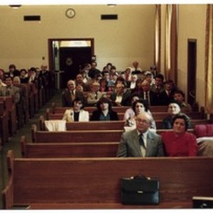 A photograph of people sitting in a church taken from the stage area. [Description English/roman)] Fotografija ljudi u crkvi snimljena s pozornice. [Description (original non-English/roman language/script)]