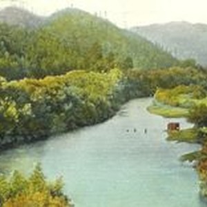 Poscard--photo hand colored: Scene of the Russian River surrounded by mountains and redwoods. Handwritten message on back to the San Jose Normal Girls (school) postmarked 1908.