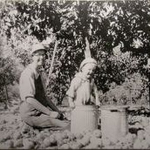 Photo--Black and white, mounted: A woman sits among apples on the ground in an apple orchard. A child stands in a metal bucket.