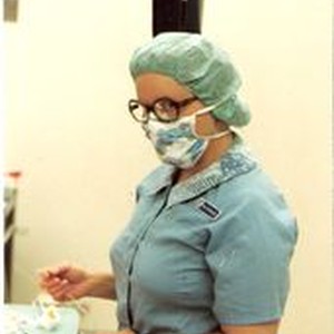 Photo--Nurse Mary Bieter, Palm Drive Hospital operating room,1979. Photo from Palm Drive Scrapbooks. Handwritten on back: "Mary Bieter the arterial pin-up girl PDH OR Sept 79."