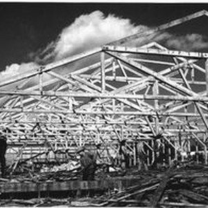 Photo--black and white: The wrecking of the Sebastopol Apple Growers Union packinghouse in 1956 to make room for the construction of the new Veterans Memorial Building on High Street. Workers have demolished the packinghouse down to the framing.