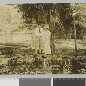 Jack and Charmian London stand beside fish pond on Jack London Ranch. Title and date transcribed from envelope. Photo has been made into a postcard. Print on bottom front reads: "Mr. & Mrs. Jack London Glen Ellen Cal." Verso of photo reads: "In the Valley of the Moon."