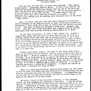 Charles Handy thought for the day on how money and profit can affect feelings of self-worth, and how society should do more to demonstrate that everyone and their individual contribution matters, October 22, 1987; Charles Handy Papers; Box 18, Folder 3; 1 page