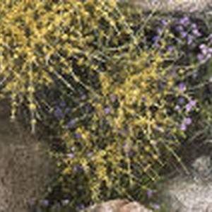 Yellow flowering jointfir and a purple flowering plant growing in a rocky environment.