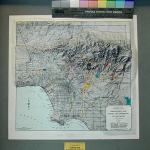A three dimensional map of the Los Angeles Basin showing flood control programs completed and authorized. At head of title: Los Angeles County Flood Control District. Sticker: Compliments of Supervisor Burton W. Chace. Relief shown by shading. Colored three-dimensional relief map, mounted within a frame. Shows county, U.S. Corps of Engineers and U.S. Dept. of Agriculture programs. Protective box with cover. Prime meridian: GM. Relief: three-dimensional. Graphic Scale: Miles. Projection: Cylindrical. Printing Process: Lithography.