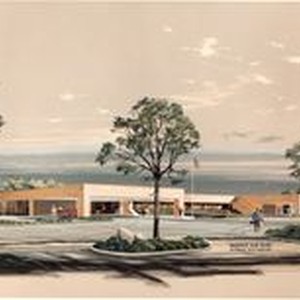 Photo, color, architect's presentation of New Palm Drive Hospital c. 1970. Printed lower right "Gresham and Smith Architects A.I.A. Nashville." Back of photograph is stamped with photographer's name "Henry Schofield."