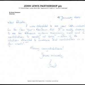 Letter to Charles Handy from Sir Stuart Hampson congratulating Handy for his C.B.E. inclusion in the New Year's Honours List, January 4, 2000; Charles Handy Papers; Box 13, Folder 8; 1 page