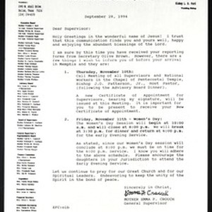 Emma F. Crouch (Church of God in Christ), Dallas, Texas, letter, 1994 September 28, to "supervisor" (Church of God in Christ). Final version. [Description English/roman)]