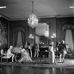 Three couples in period costume in the east end of the library. The couple on the left sit at a mechanical writing table (table à écrire, or, table mécanique), possibly by Jean-François Oeben, circa 1755 to 1765. Behind them is a fire screen, "L'Amour Vendangeur (Cupid, the Vintager)", made at the Beauvais Manufactory after a cartoon following Francois Boucher in 1738 to 1740 or in 1767. The couple on the right, with the man playing the violin, stand in front of a writing desk (bureau plat), attributed to the Pagoda Master, made circa 1730. The third couple stand in the background next to the fireplace. Hanging on the wall on the left is a Beauvais tapestry, "Le Fontaine d'Amour (The Fountain of Love)." The chairs belong to the set of two settees and ten chairs whose upholstery covers were woven at Gobelins Manufactory, Paris, probably under the supervision of Jacques Neilson (1714-1788), after design by François Boucher (1703-1770) and Jean-Baptiste Oudry (1733-1755). The covers were woven circa 1779, and the frames are nineteenth century. Label accompanying photograph in album reads "HEH 31 East end of Library room in Huntington Art Gallery. Beauvais tapestry at left. Chairs, Louis XVI; tables, screen, Louis XV period; Savonnerie carpet, Louis XIV period."