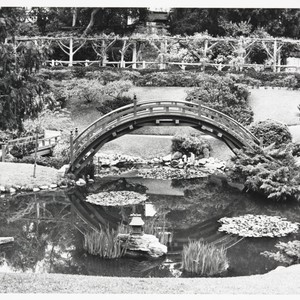 View of the ponds of the Japanese garden, with the steeply sloping drum bridge in the center and the wisteria pergola on the east ridge of the garden canyon in the background. On verso: Staff photo by Margaret Stovall, 1972.
