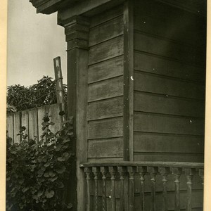 Adobe, Monterey, California: clapboard siding detail, geraniums.