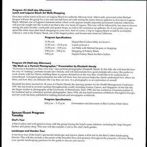 Health Management conference announcement featuring a session with Elizabeth Handy. The document indicates that the talk will first feature lunch at Javier's followed by an art walk at Laguna Beach, guided by artist Michael Jacques. It proceeds to indicate that the rest of the afternoon will be spent in Elizabeth Handy’s seminar, in which she presents her approach to making portrait photography. Handy's goal is to reveal to clients how others see them, and how they wish to portray themselves. The document also provides a brief biographical sketch of Elizabeth Handy, exploring her relationship with her husband and the particular course she has taken to become a photographer, which began in her late 40s. Other events scheduled for the day include a Chef's Tour, led by a Ritz-Carlton chef, and a Landscape and Garden Tour, a one-hour tour of the Ritz-Carlton's landscaping and interior plants.