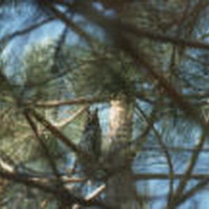 Owl perched in tree.