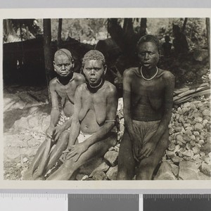 Three Malaitan women sit on a pile of stones, looking directly into camera. Title transcribed from envelope. Date from biographical sources. Verso of photo reads: "Solomons Malaita Bush The real things that kept us armed night & day Charmian."